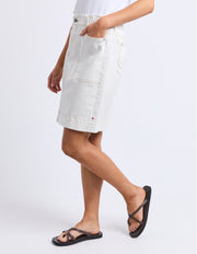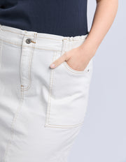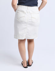 Comfort plus denim skirt for all day wear. The Atlas Denim Skirt features a comfortable elastic waist with front patch pockets and all the Elm denim bells & whistles.